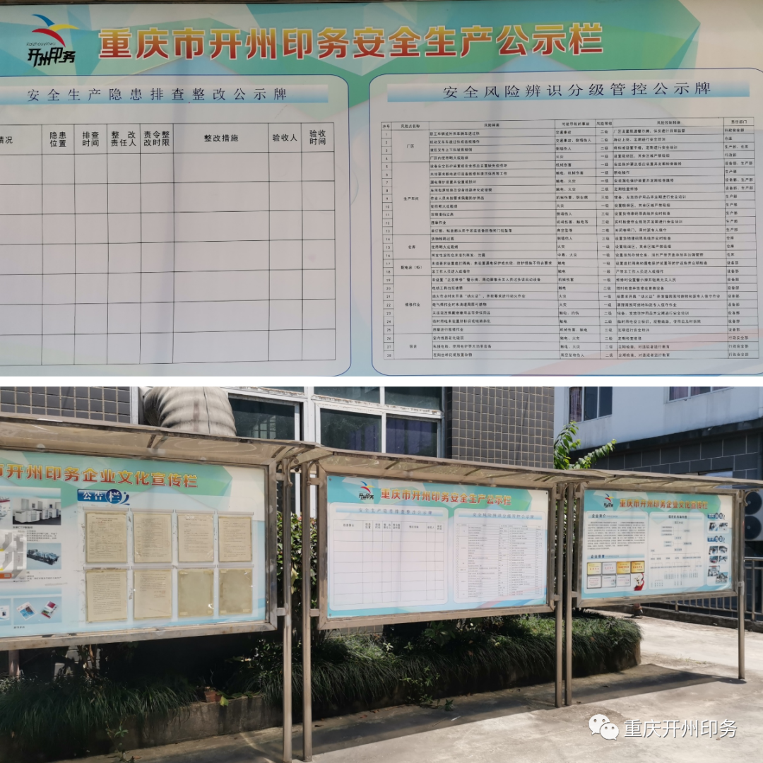 公司公告栏设立隐患排查整改和安全风险辨识分级管控公示牌。